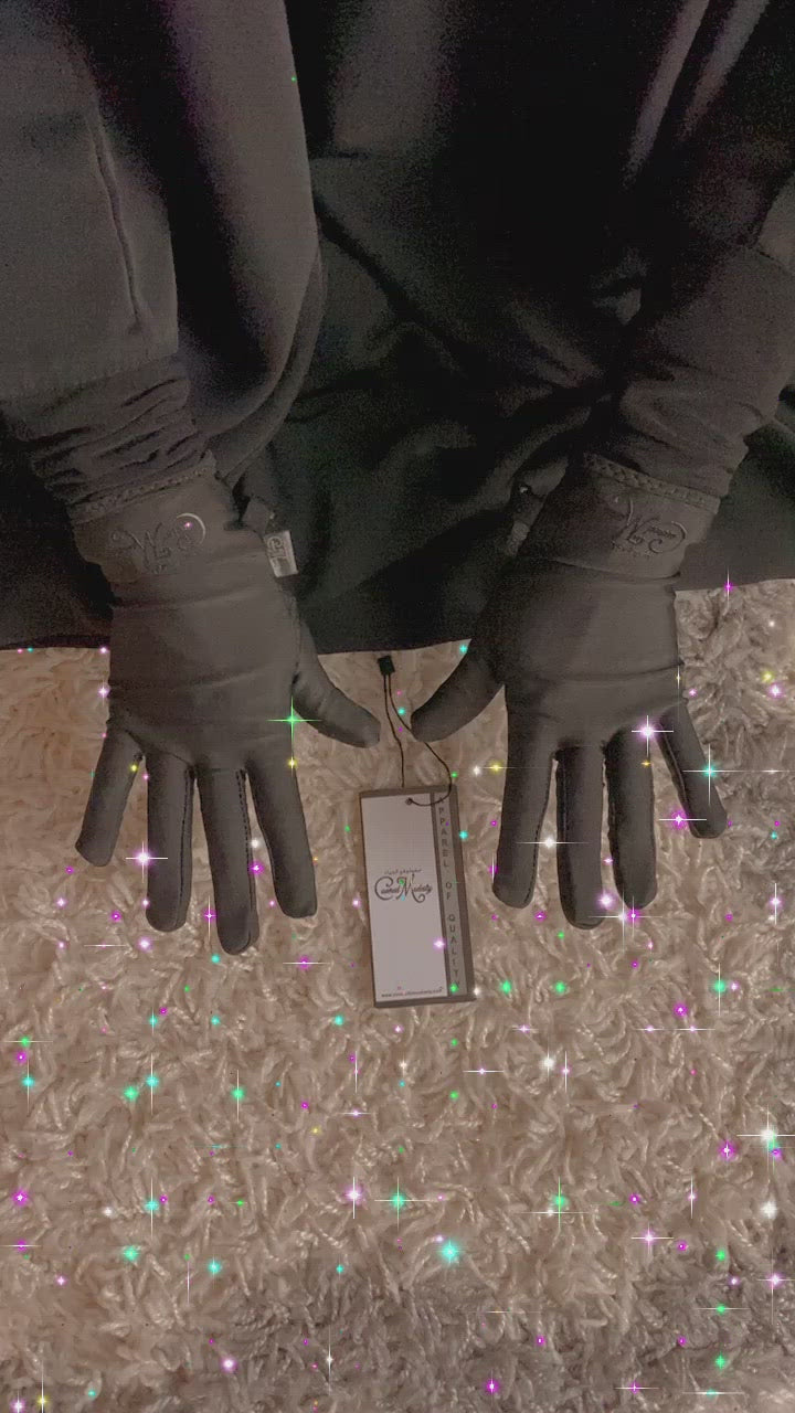 Our exquisite touch screen gloves were designed by our team to give you ease and comfort. They do have a slight Sateen shine to them. WRIST LENGTH. These DO NOT have the lining. Both gloves come with small attachment pieces you can connect when your not using them.